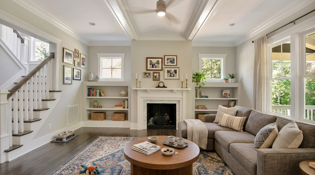 Persona and Prompt: I'm a real estate agent working with special client. They're ready to purchase but just need to see a few real-world ideas of how one particular listing might work for them. The neighborhood is great, but they think the main living room is a little too symmetric and formal. They want something more relaxed and casual. It'd be great if they could better understand how the main living space might look based on our conversations about their lifestyle and design tastes. They don't have any children, but they do have a small dog. They like casual, modern furnishings that's easy to clean and comfortable. They also need to display some photos of friends and family. Overall, they don't want to use paint colors that are too dark. They prefer lighter neutral tones that creates a relaxed welcoming environment that's a compliment to existing room. Please render this space based on their tastes, style of living, and similar requirements. Thank you.